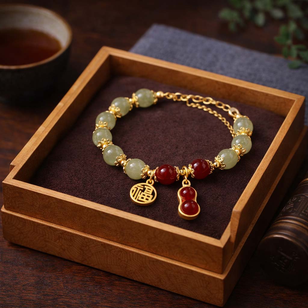 This bracelet brings together jade, red stone, and symbolic charms—each chosen for its meaning rather than appearance.
